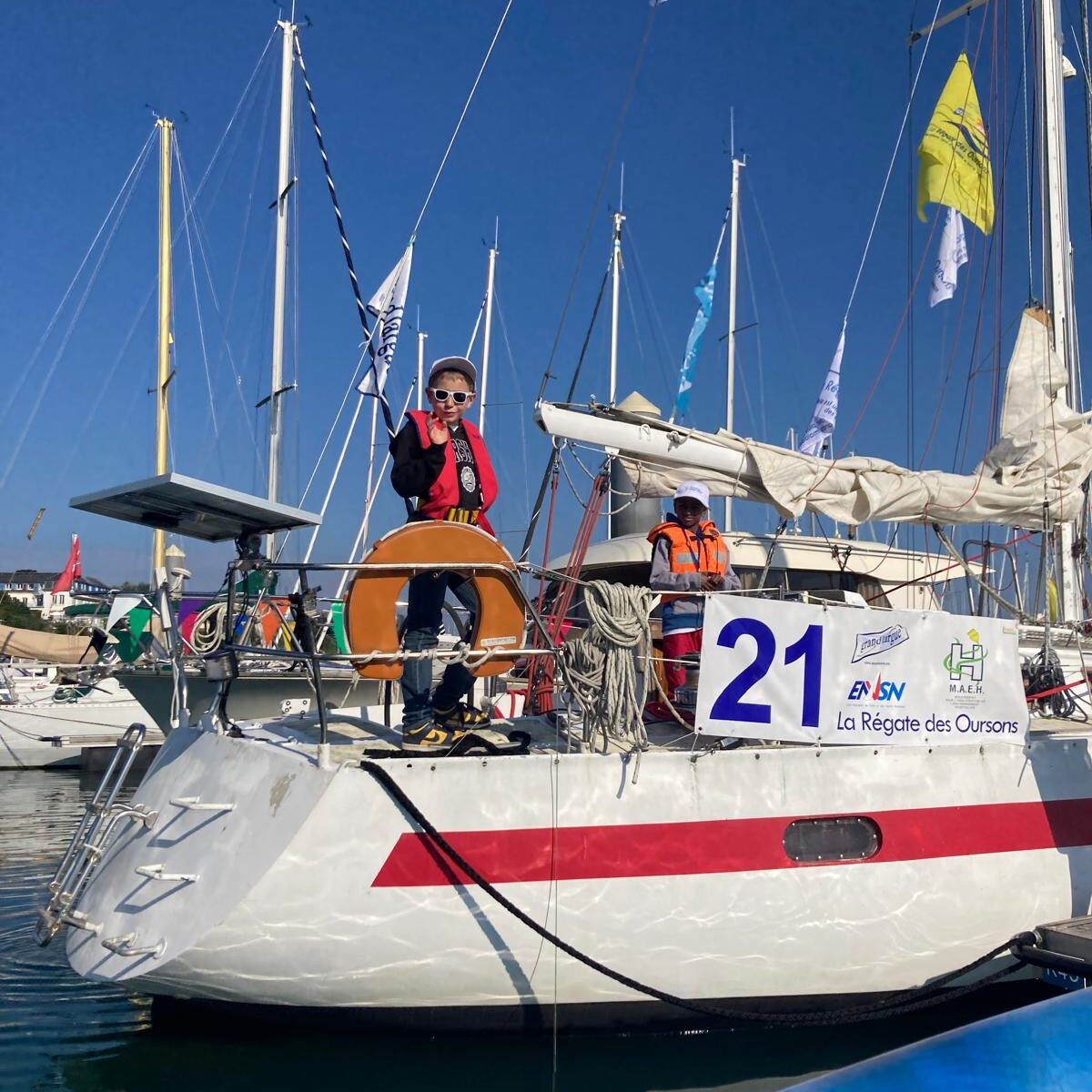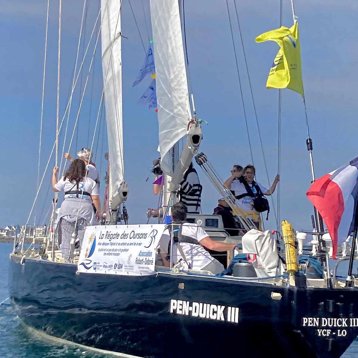Du 20 au 23 juin, 45 enfants malades des hôpitaux AP-HP Robert-Debré, Jean Verdier et de l’hôpital Fondation Adolphe de Rothschild ont participé à la 32ème édition de la Régate des Oursons et ont eu le grand plaisir de découvrir la mer, la navigation à la voile , la faune et la flore … avec la participation des célèbres voiliers d’Eric Tabarly, Pen Duick II et III, d’Arnaud PENNARUN et de la flotte de l’Association Initiatives Grand Largue, en présence de la marraine de l’évènement Jacqueline Tabarly.